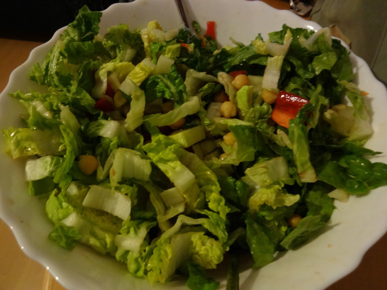 Salat aus Miniromana, Tomate, Paprika, Kichererbsen und fettfreiem Dressing